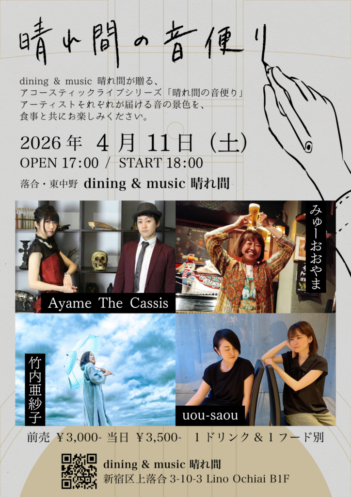 ■出演 Ayame The Cassis / みゅーおおやま / 竹内亜紗子 / uou-saou OPEN 17:00 / START 18:00 前売 ¥3,000 当日 ¥3,500 1ドリンク&1フード別