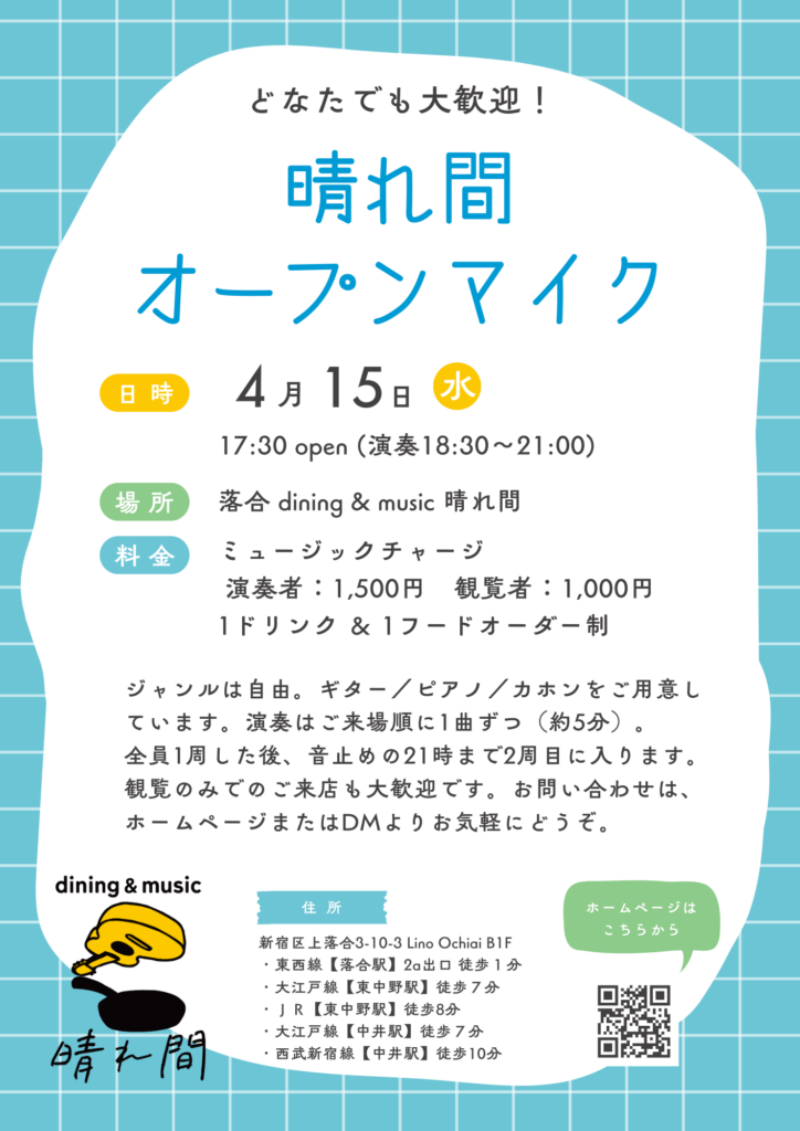 dining & music 晴れ間 > スケジュール > 4/15(水) 晴れ間オープンマイク