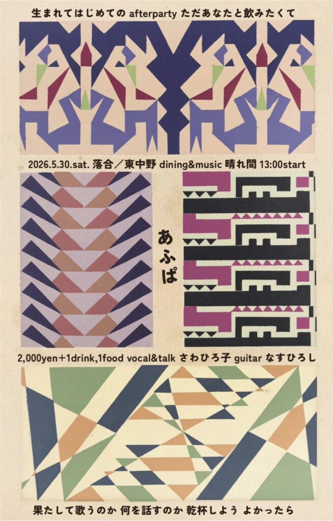 さわひろ子 recording album release party「りりぱ」after party ■出演 vocal&talk さわひろ子 / guitar なすひろし OPEN 12:30 / START 13:00 ticket ¥2,000 1ドリンク&1フード別