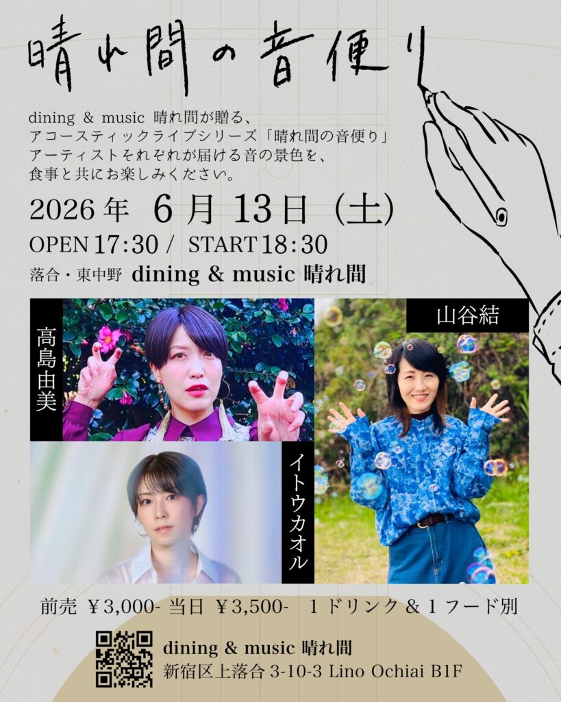 ■出演 イトウカオル 高島由美 山谷結 OPEN 17:30 / START 18:30 前売 ¥3,000 当日 ¥3,500 1ドリンク&1フード別
