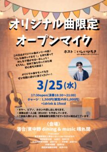 ホスト:いしいひろき 17:30オープン(演奏18:30〜21:00) ミュージックチャージ:演奏者:¥1,500 観覧者:¥1,000 ※1ドリンク&1フード別