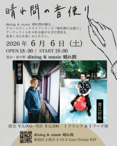 ■出演 青江好祐 / 菅原龍平 OPEN 18:00 / START 19:00 前売 ¥3,000 当日 ¥3,500 1ドリンク&1フード別
