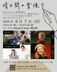 ■出演 はちみつ / 彩七 / みゅーおおやま / マホガニー&コア OPEN 17:30 / START 18:30 前売 ¥3,000 当日 ¥3,500 1ドリンク&1フード別