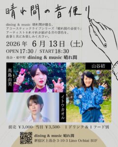 ■出演 イトウカオル 高島由美 山谷結 OPEN 17:30 / START 18:30 前売 ¥3,000 当日 ¥3,500 1ドリンク&1フード別
