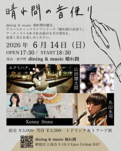 ■出演 丸山永司 エナミハナ。 山田雄太郎 Kenny Stone OPEN 17:30 / START 18:30 前売 ¥3,000 当日 ¥3,500 1ドリンク&1フード別