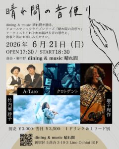 ■出演 A-Taro クロトゲント 増子周作 竹内亜紗子 OPEN 17:30 / START 18:30 前売 ¥3,000 当日 ¥3,500 1ドリンク&1フード別